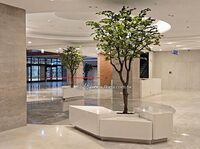 現代化、大尺度的大廳空間, 我們將「仿真銀杏樹」與不規則的「白色幾何座椅」完美結合,讓功能性(座椅)與美觀度(植栽)無縫接軌。